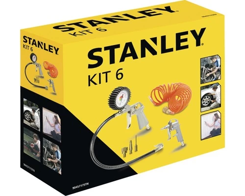 Snel aan de slag met je compressor? Kies dan voor deze mooie 6- delige luchtgereedschapset van STANLEY. Een mooie basisset met daarin een blaaspistool, een bandenpomppistool met manometer, 3 mondstukken en een spiraalslang.