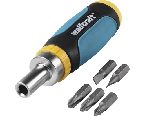 Wolfcraft Mini hand schroevendraaier met ratel. Ideaal voor het comfortabel werken in smalle ruimtes. Inclusief 5 bits.
